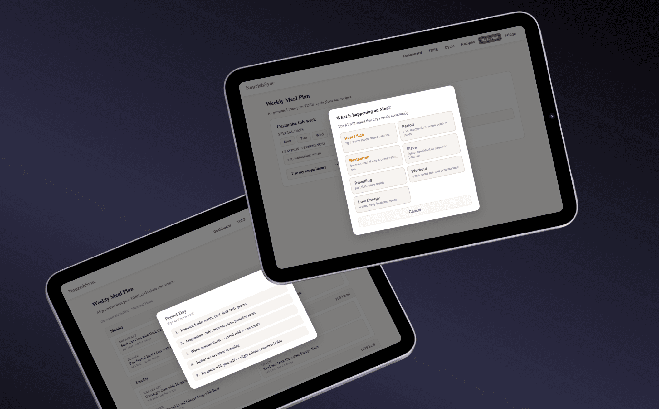 NourishSync is a product concept exploring how nutrition apps can move beyond generic calorie calculators and create personalized meal plans based on real-life conditions.